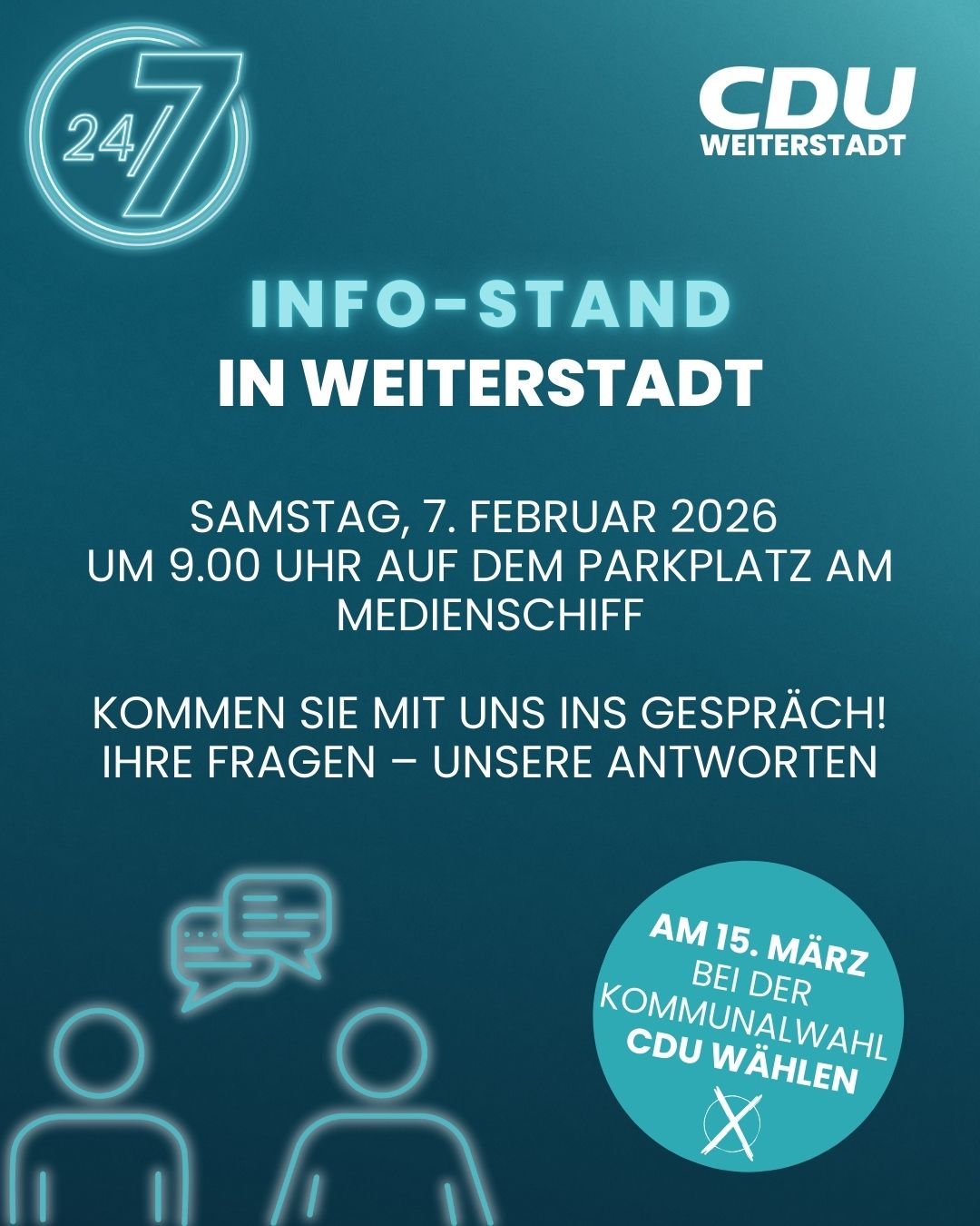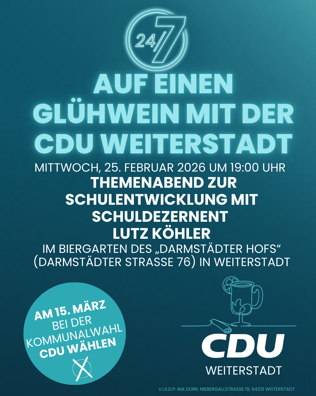 Drei Tage vor der Bürgermeisterwahl und 71 Stunden vor Schließung der Wahllokale lädt CDU-Kandidat Sebastian Sehlbach zu „Zwiebelkuchen & Federweißer“ am Donnerstag, den 25. September 2025 um 19:00 Uhr in die Gaststätte „Zur Schönen Aussicht“ (Bahnhofstraße 18) in Weiterstadt ein. An diesem Abend können Bürgerinnen und Bürger in entspannter Atmosphäre mit dem Kandidaten ins Gespräch kommen.