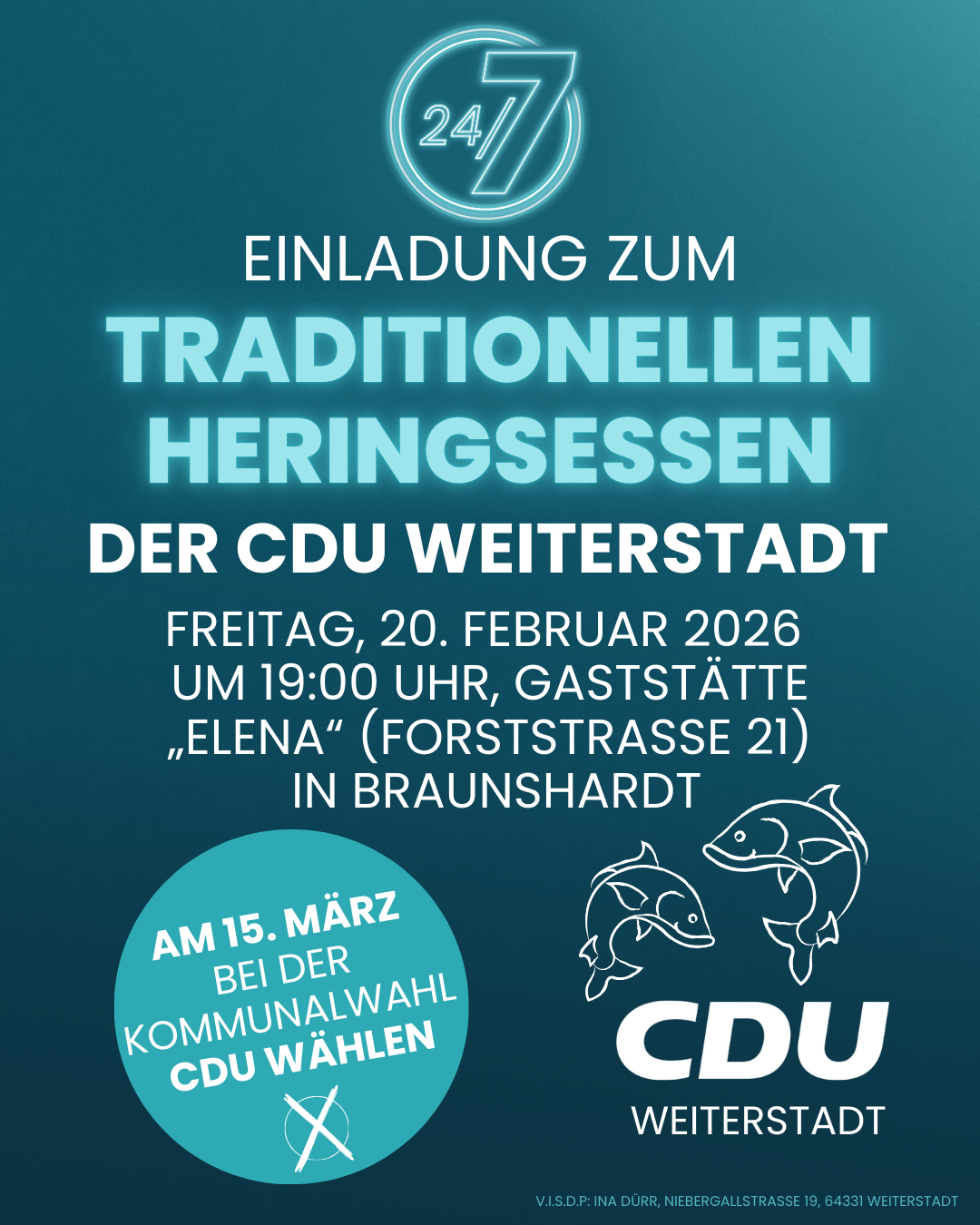 Am Freitag, den 20. Februar 2026 um 19:00 Uhr lädt die CDU Weiterstadt alle interessierten Bürgerinnen und Bürger zum traditionellen Heringsessen ins Restaurant Elena (Forststraße 21) nach Braunshardt ein. Dort wird die Vorsitzende der CDU Weiterstadt und neue Landtagsabgeordnete Ina Dürr über ihre ersten 50 Tage im Hessischen Landtag berichten. „Natürlich kann man an diesem Abend auch etwas anderes als leckeren Heringssalat mit Pellkartoffeln essen“, stellt Ina Dürr klar. Darüber hinaus legen die Christdemokraten ihren Fokus auf die Kommunalwahl am 15. März 2026 und stellen nochmals ihr Zehn-Punkte-Zukunftsprogramm für Weiterstadt vor. Die Kandidatinnen und Kandidaten stehen gerne für persönliche Gespräche zur Verfügung.