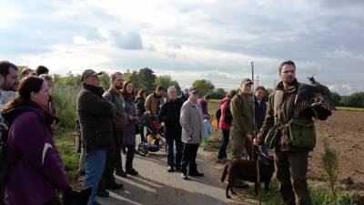 Am darauffolgenden Sonntag, den 9. Oktober 2016 startete nachmittags als zweite Veranstaltung der CDU-Woche ein Waldspaziergang mit Jäger Patrick Meinhardt an der Keller-Ranch. Während des Spaziergangs, an dem auch die Bürgermeisterin von Mühltal, Dr. Astrid Mannes – die von den CDU-Kreisvorständen zur Bundestagskandidatin vorgeschlagen wurde – teilnahm, erläuterte Meinhardt die ökologischen Gründe für die Jagd und die weitläufigen Aufgaben eines Jagdpächters. „Ein Jagdrevier zu betreuen ist eine sehr umfangreiche Aufgabe. Man muss Tag und Nacht verfügbar sein und die Tiere bei Bedarf auch im Winter mit ausreichend Futter und Wasser versorgen“, erklärte Meinhardt den 30 Teilnehmern des Spaziergangs. Er informierte auch über die verschiedenen Tierbestände und deren Entwicklungen in Weiterstadt. So erfuhren die Teilnehmer beispielsweise, dass Weiterstadt eine der höchsten Hasenpopulationen Hessens hat. Ein weiterer Höhepunkt des Spaziergangs war auch die Jagdvorführung des Falkners Felix Jüstel, der mit seinem Wanderfalken an einer Attrappe die Jagd auf Krähen demonstrierte.