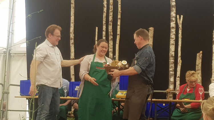 „Sie sind jo schneller wie a Mulinex“, kommentierte Moderatorin Woody Feldmann die flinke Hand von Dürr. Mitstreiter des Wettschälens waren die Bundestagsabgeordnete Daniela Wagner (Bündnis 90/Die Grünen), Landrat Klaus-Peter Schellhaas (SPD), Matthias Geertz (ALW) und Manfred Berger (FWW). Die Spendensumme der Spargelfestivalveranstalter ergab sich aus dem Gesamtgewicht aller geschälten Spargel mal zehn. Und dann rundeten die Veranstalter Thiemo Hamm und Peter Lipp den Betrag auf 800 Euro auf. Die Siegprämie von 800 Euro fließt auf Wunsch von Ina Dürr an den Weiterstädter Warenkorb e.V.