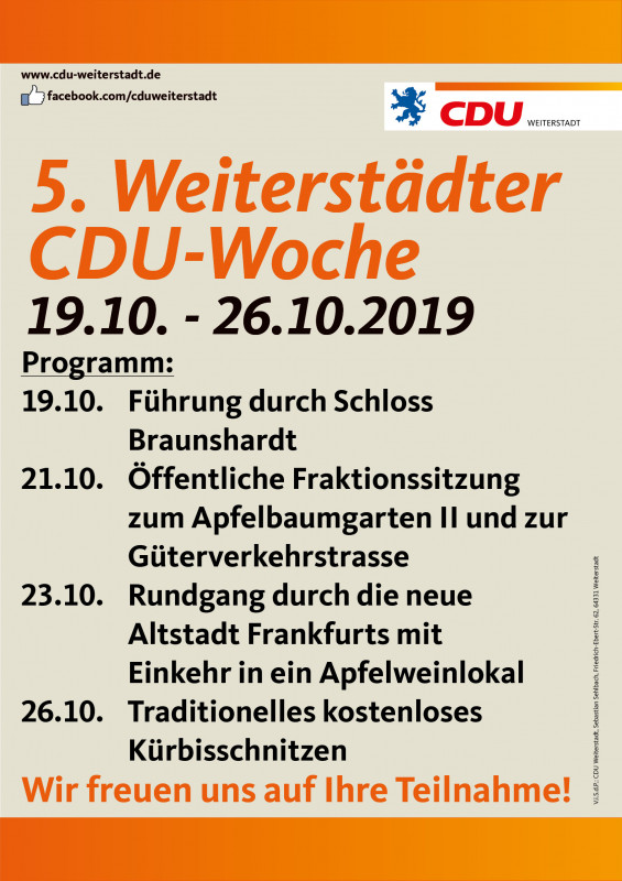 „Wir bieten den Weiterstädter Bürgerinnen und Bürgern im Rahmen der 5. CDU-Woche vom 19. bis 26. Oktober 2016 innerhalb von acht Tagen mit vier Veranstaltungen wieder ein vielfältiges Programm an“, berichtet der CDU-Vorsitzende Sebastian Sehlbach von den Planungen. „In diesem Jahr mixen wir altbewährte Termine wie das Kürbisschnitzen und die öffentliche Fraktionssitzung mit einer kostümierten Führung durch Schloss Braunshardt und einem Rundgang durch die neue Altstadt Frankfurts mit anschließender Einkehr in Sachsenhausen.“