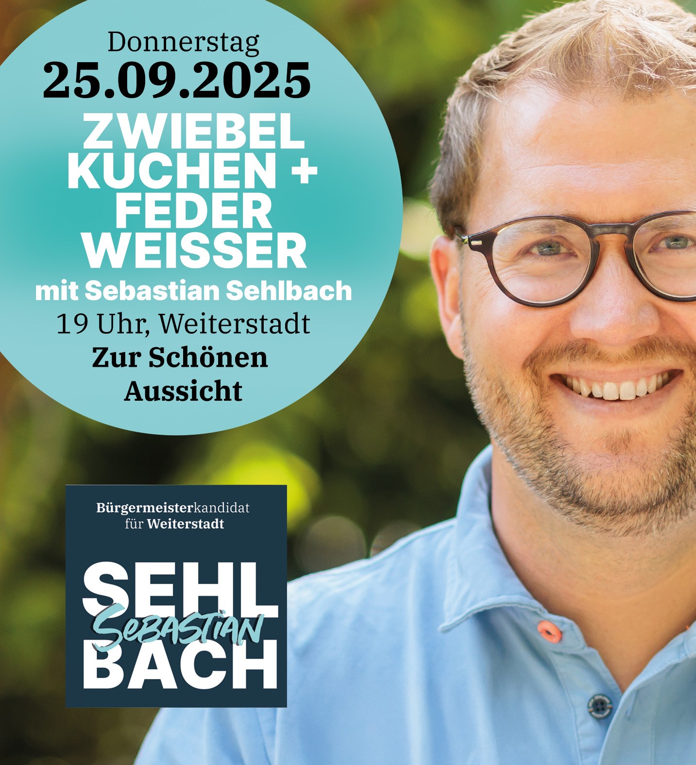 Drei Tage vor der Bürgermeisterwahl und 71 Stunden vor Schließung der Wahllokale lädt CDU-Kandidat Sebastian Sehlbach zu „Zwiebelkuchen & Federweißer“ am Donnerstag, den 25. September 2025 um 19:00 Uhr in die Gaststätte „Zur Schönen Aussicht“ (Bahnhofstraße 18) in Weiterstadt ein. An diesem Abend können Bürgerinnen und Bürger in entspannter Atmosphäre mit dem Kandidaten ins Gespräch kommen.