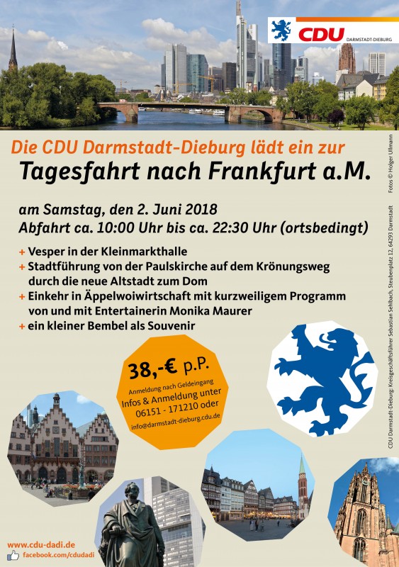 Der traditionelle Tagesausflug der CDU Darmstadt-Dieburg führt in diesem Jahr in die hessische Metropole Frankfurt am Main. Ganz nach dem Motto: „Volle Kraft für Hessen“ wird den Teilnehmerinnen und Teilnehmern am Samstag, den 2. Juni 2018 ein vielfältiges, hessisches Programm geboten. Nach einer anfänglichen kleinen Vesper in der Kleinmarkthalle startet ein Stadtrundgang an der Paulskirche, der die Gruppe über den Römerberg bis in die fertiggestellte, rekonstruierte „neuen“ Altstadt am Kaiserdom führt. „Im Jahr der Landtagswahl freuen wir uns, dass wir Hessens größte Metropole, das Herz unserer Region im Rhein-Main-Gebiet, besuchen und die neue Altstadt kurz nach ihrer feierlichen Eröffnung besichtigen“, sagt der Weiterstädter CDU-Vorsitzende Sebastian Sehlbach. Auf dem Krönungsweg wandeln die Teilnehmerinnen und Teilnehmer quer durch Frankfurts Innenstadt, bevor Zeit eingeplant ist, um auf eigene Faust die Altstadt näher zu erkunden oder einen Kaffee zu trinken.