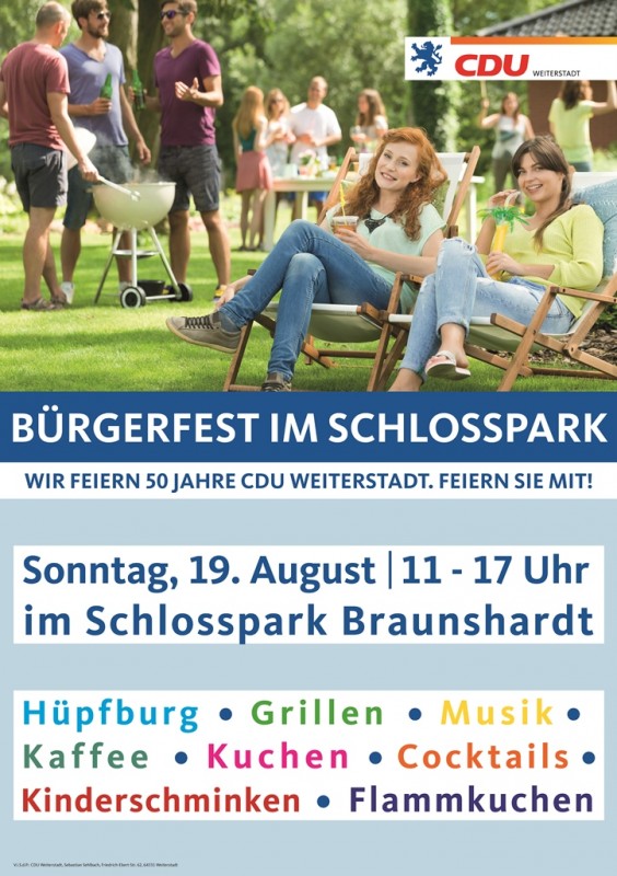 „Alle Bürgerinnen und Bürger sind für kommenden Sonntag, den 19. August 2018 von 11:00 Uhr bis 17:00 Uhr zu unserem Bürgerfest in den Schlosspark Braunshardt eingeladen. An diesem Tag wollen wir das 50-jährige Jubiläum des CDU-Stadtverbandes Weiterstadt feiern“, berichtet der Vorsitzende Sebastian Sehlbach.